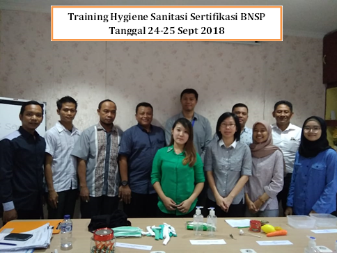 PT. Ganesha Inti Persada menyelengarakan pelatihan Hygiene dan sanitasi sesuai dengan PMK Nomor 1096/Menkes/PER/VI/2011 tentang Persyaratan hygiene sanitasi Jasaboga dan No. 1098/MENKES/SK/VII/2003 tentang persyaratan Hygiene dan Sanitasi Restauran dan Rumah Makan.