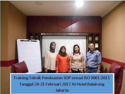 Dalam Pelatihan ini akan diberikan arahan kepada tim dalam organisasi untuk menyesuaikan, meng-upgrade dan merevisi dokumen SOP prosedur, WI working instruction, maupun menyusun dokumen baru yang memenuhi persyaratan ISO 9001:2015